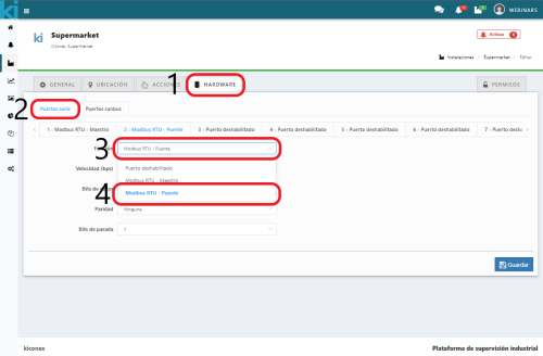 2. Seleccionar la pestaña hardware (1), seguido del puerto serie (2), seleccionar la pestaña de función (3) donde se desplegarán las opciones en las que podemos configurar el puerto, las opciones son Deshabilitado, Maestro o Puente, seleccionar modo puente (4).
