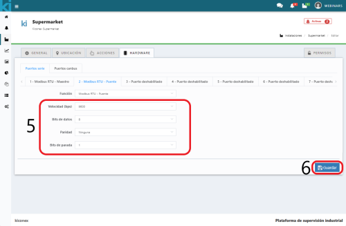 3. A continuación, saldrá la configuración de la velocidad de trabajo (5), se debe comprobar la velocidad con la que trabaja la máquina y tener en cuenta que debe estar configurado de la misma forma tanto en la máquina como en la plataforma. Por último seleccionar el botón de guardar (6).