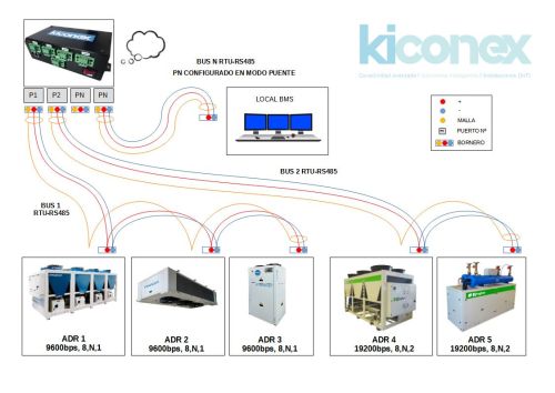 Se utilizan como puente uno de los puertos del kibox, éste puerto al ser configurado en modo bridge funcionará como esclavo facilitándole los datos de los equipos conectados al kibox al segundo sistema de supervisión (BMS, Scada, etc) que a su vez trabaja como maestro solicitando los datos a las máquinas/equipos conectados.