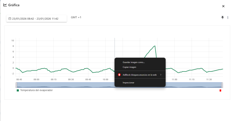 Existe la posibilidad de guardar de forma permanente la gráfica, con el objetivo de tenerla accesible desde la lista de gráficas del usuario (menú lateral izquierdo) o desde la lista de gráficas de la instalación (menú "GRÁFICAS" dentro de la instalación). En las siguiente imágenes, se muestra una gráfica con los datos de varias variables, y el proceso de guardado: