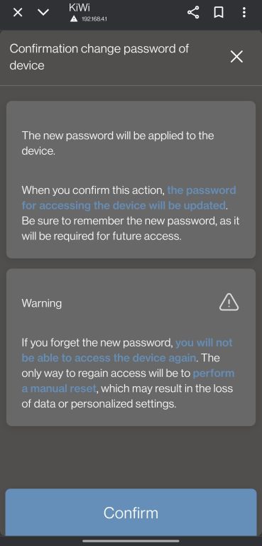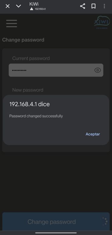 Captura de pantalla del campo contraseña en configuración del KiWi - La primera vez que accedamos a la configuración nos pedirá modificar la contraseña para maximizar la seguridad de la instalación. Rellenamos con la contraseña anterior y posteriormente la nueva contraseña de forma duplicada para confirmar que está correcta.